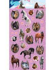 13 klistermærker med motiver af heste. Klistermærkerne er fordelt på ét ark og måler cirka 17x10 cm.