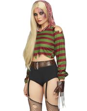 Vores Freddy Krueger-kostume er omhyggeligt skabt for at genskabe hans skræmmende udseende fra filmene. Det inkluderer den klassiske brune hat, som han altid bærer, samt den ikoniske røde og grønne stribede sweater, der har hjemsøgt vores mareridt i generationer.