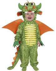 Dragekostume består af jumpsuit med orange parti på maven, lynlås foran, hætte med hoved og hale. Dyrekostumet kan bruges af begge køn. Suppler gerne dit kostume med teatersminke. - Størrelsestabell Smiffys