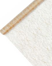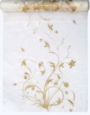Hvid Organzaløber med Guldfarvet Blad-Design 48 cm x 9 meter