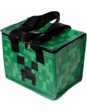 Genbrugelig køletaske med motiver fra Minecraft, med Minecraft-logoet på låget og forskellige ansigter og blokke fra spillet omkring tasken. Dele af køletasken er lavet af genbrugte plastikflasker, så du kan bruge denne med god samvittighed ;)