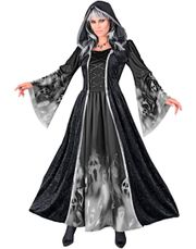 Nonne-spøgelse damekostume består af lang kjole, bælte og matchende hætte. Suppler gerne med karnevalsminke for et komplet outfit.