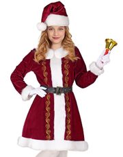 Rødt nissekostume til dame bestående af kjole med hvide kanter, krave og pynteknapper. Nissehue og bælte følger også med i pakken.