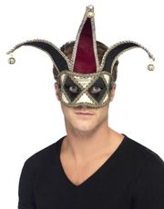 Sort hofnarer øjenmaske med farverigt glimmer og knuder. Brug dette til dit hofnar-kostume eller andre karakterer. - Store ordrer