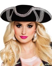 Sort pirathat dekoreret med sorte blondekanter, guldfarvede kanter og sløjfer. - Store ordrer