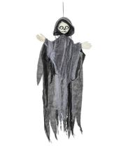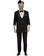 Kostumet består af en sort kjole med hvide kranier, der pryder bunden af dragten. Denne uhyggelige og stilfulde detalje giver kostumet en ekstra touch af skræmmende elegance.